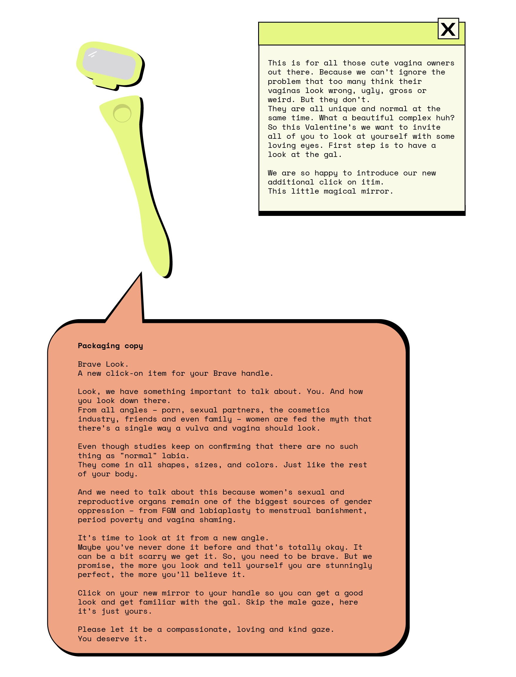 Problem: Not shaving is an invisible choice, as it doesn’t require any tools like a razor. This makes it difficult to give it representation. In stores we see tons of different options for hygiene products for periods, but there seems to be only one choice for body hair. Shave it.