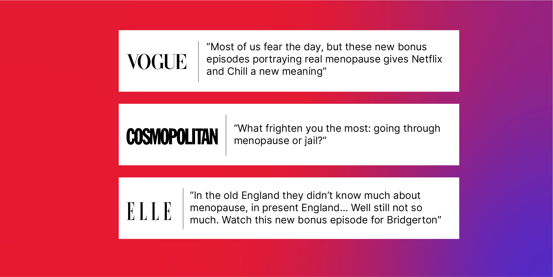 Campaign: Mainstream Menopause is a series of new scenes within Netflix’s original content. The scripts for the scenes are based on Refinery29 reader’s stories from their menopause, ensuring that we get a nuanced and real picture of what menopause can be.