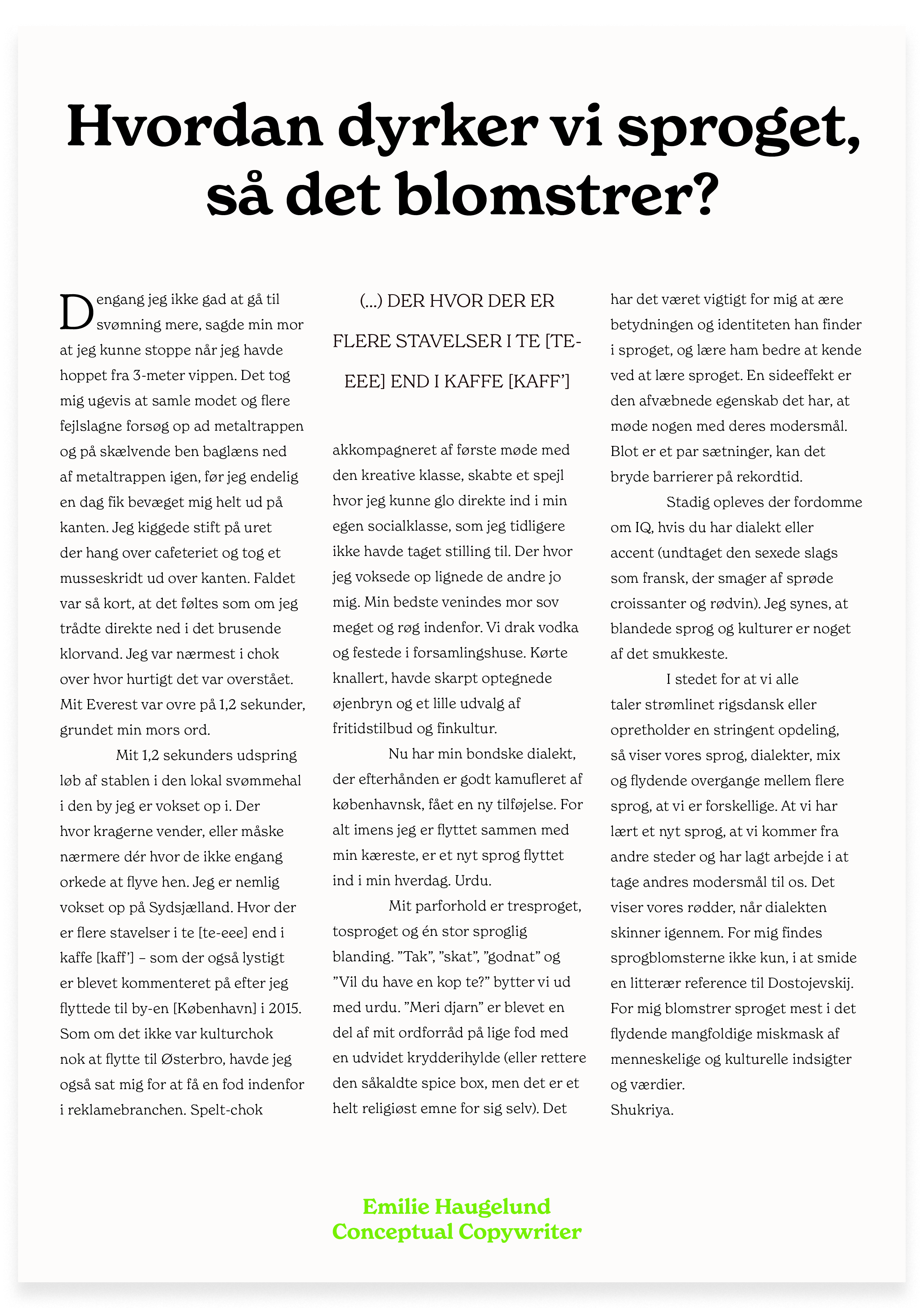 Sprog fylder meget, både i mit professionelle og private liv. Jeg har skrevet noget der mest er til mig selv, og som ikke prøver at sælge dig noget. Tanker og refleksioner over sproget og dets betydning for hvem vi er som mennesker og hvordan andre opfatter os. Tanker jeg kan bruge i mit arbejde, når jeg skriver for virksomheder og kampagner.