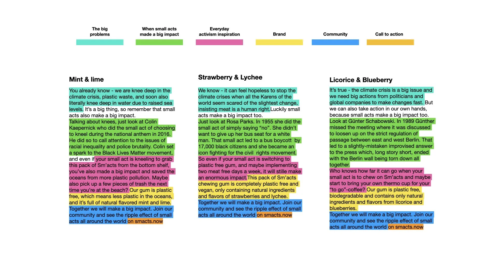 Or art direction for copywriters. This is a package copy for a gum brand I’ve invented. It’s without plastic and on a mission to make you take small actions for the environment. Like switching to plastic free gum. Because small acts makes a big difference in the end.